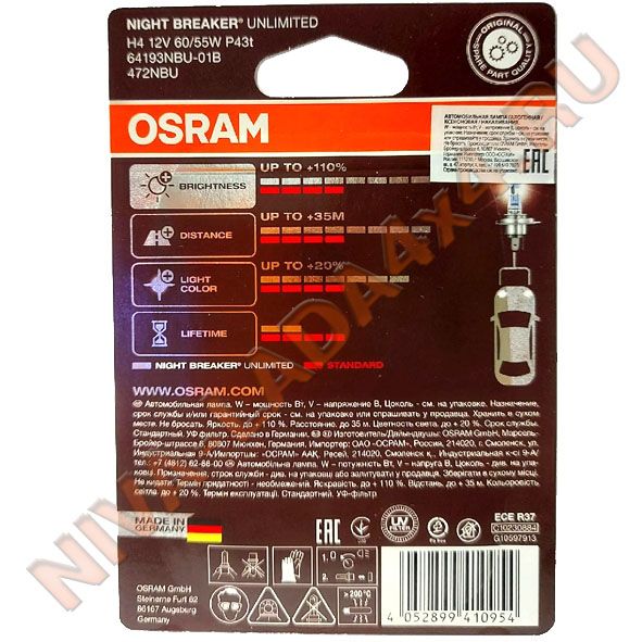 Лампа H4 Osram 60/55+110% (64193 NBU-01B) Night Breaker Unlimited блистер Отзывы