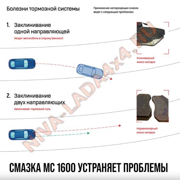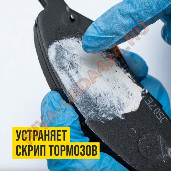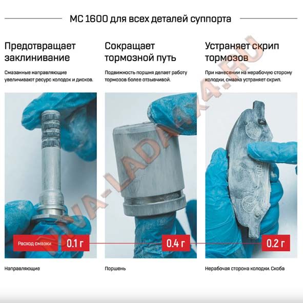 Нанесение МС 1600 на нерабочие стороны колодок предотвращает скрип тормозов. Наносится тонким слоем на предварительно очищенную поверхность и её торцевые части.